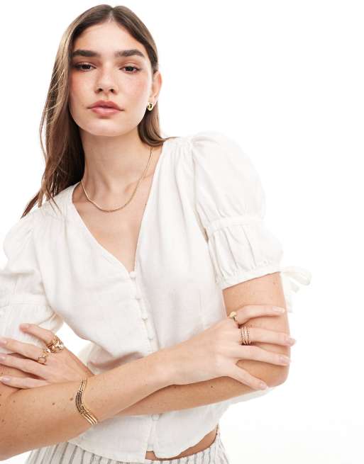 ONLY – Gräddvit blus i linneblandning med knäppning