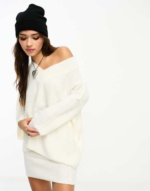 Only – Gräddvit fluffig tröja i lång modell med v-ringning, del av set