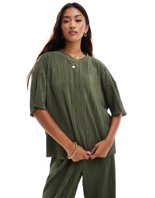 ONLY – Khakifärgad, plisserad t-shirt i boxig passform, del av set