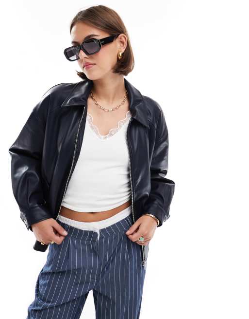 ONLY – Marinblå bomberjacka i läderimitation