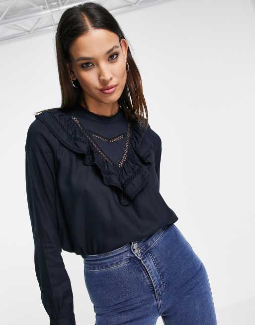 Only – Svart blus med spetsdetalj och volang