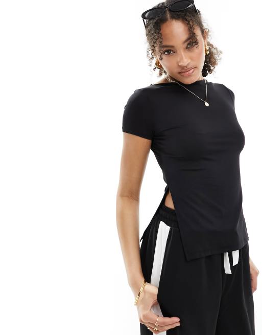 ONLY – Svart t-shirt i lång modell med holkärmar och sidoslits
