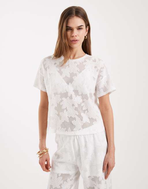 ONLY – Vit t-shirt i spets med boxig passform, del av set