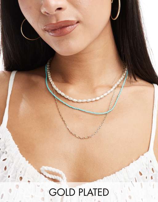 Orelia – Halsband i 3 rader med guldplätering, pärlor och turkosa stenar