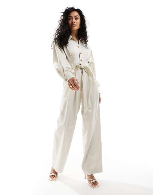& Other Stories – Ljusbeige jumpsuit med långa ärmar, knappar framtill och knytning i midjan