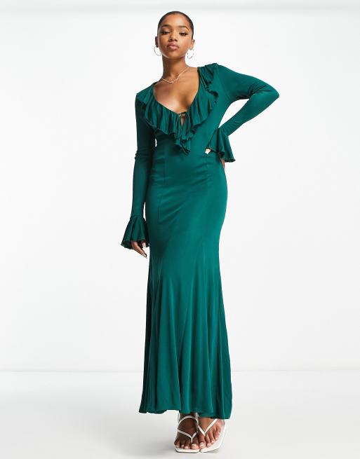 & Other Stories – Mörkgrön maxiklänning med v-ringning och volang