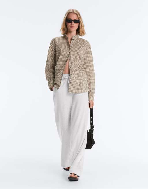 OYSHO – Beigerutig skjorta i bomullsmix med ståkrage