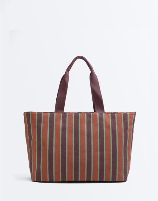 OYSHO – Grå, randig toteväska i canvas