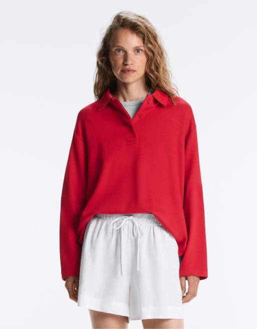 OYSHO – Klarröd pikétröja med långa ärmar