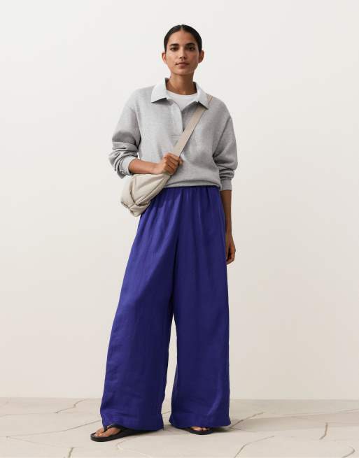 OYSHO – Koboltblå byxor i 100% linnetyg med vida ben och sidoveck