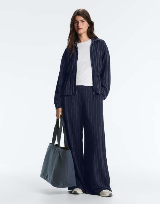 OYSHO – Marinblå, mjuka byxor med vida ben och sidoveck i modal