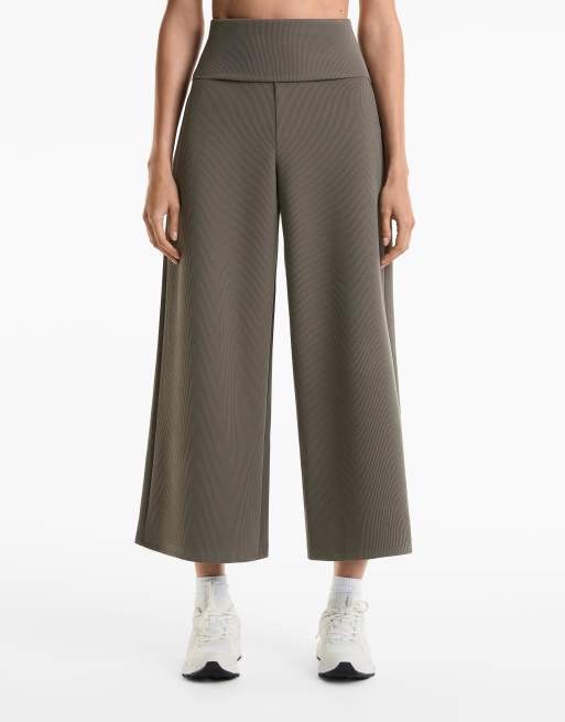 Oysho – Mörkgrå, ribbade byxor med nedvikt midja och vida ben