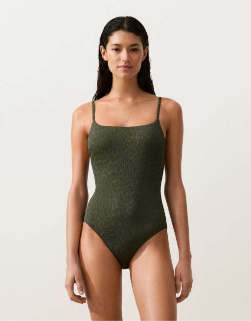 OYSHO – Mörkt kakifärgad, texturerad baddräkt med leopardmönster