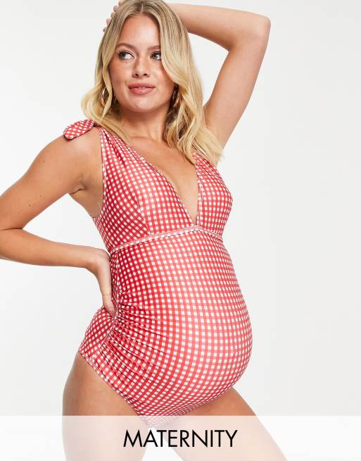Peek & Beau Maternity – Exclusive – Röd ginghamrutig baddräkt med knytning på axlarna
