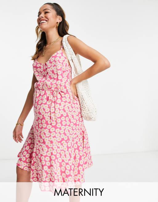 Pieces Maternity – Rosa, blommig och kort slipklänning med knäppning framtill