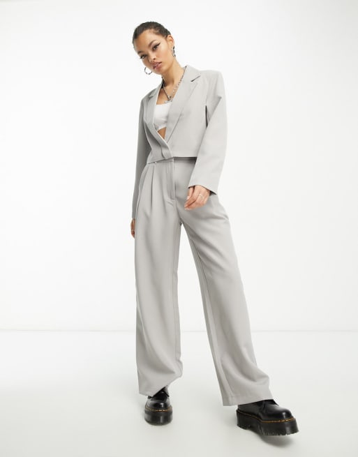 Pieces Petite – Exclusive – Grått set med kort kavaj och figursydda byxor