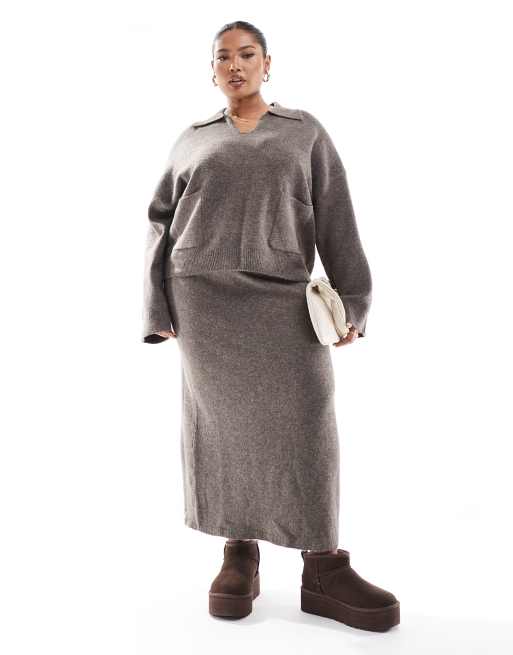 Pieces Curve – Brungrå, stickad maxikjol, del av set