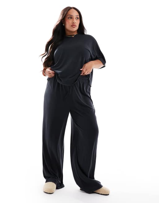 Pieces Curve – Svart, supermjukt, silkigt set med t-shirt med boxig passform och byxor med vida ben