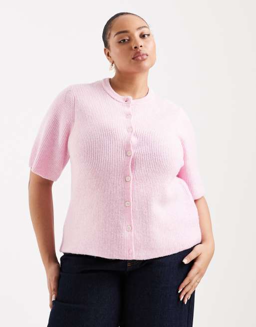 Pieces – Rosa, stickad, mjuk kofta med korta ärmar