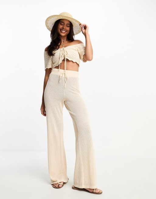 Pieces – Beige, virkat set med crop top och vida byxor