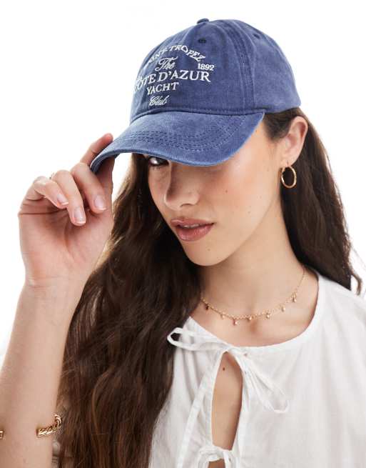 Pieces – Blå keps med Cote D'Azur-tryck och tvättad finish