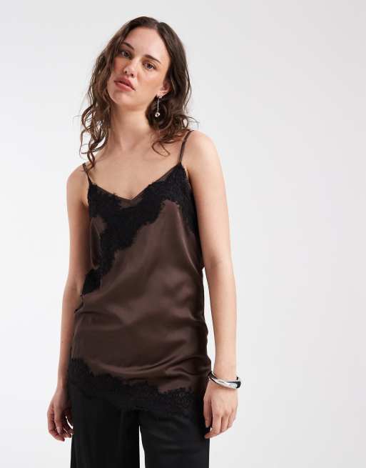 Pieces – Chokladbrunt, asymmetriskt linne i satin med spetskant