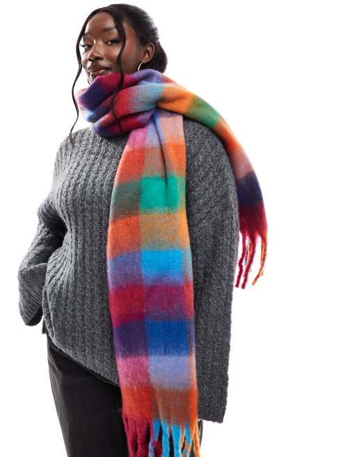 Pieces – Flerfärgad, supermjuk halsduk med fransar och rutigt mönster