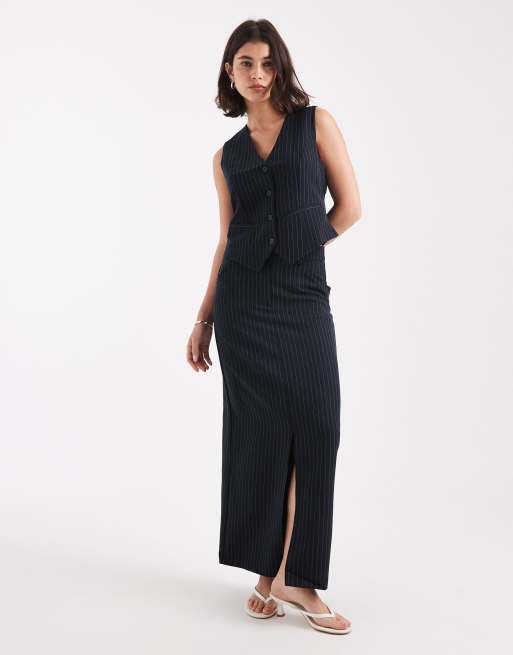 Pieces – Marinblå, kritstrecksrandig maxikjol, del av set