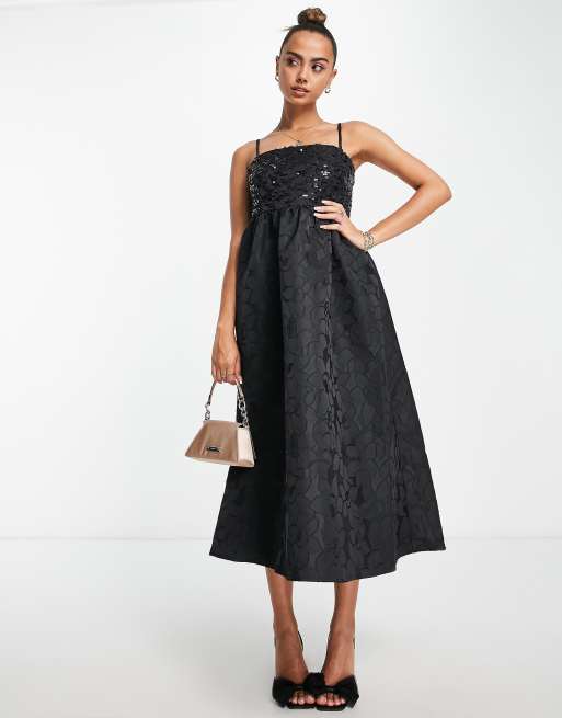 Pieces – Premium – Svart, paljettprydd midiklänning i babydoll-modell med smala axelband
