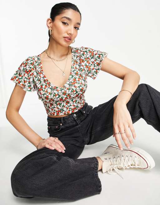Pieces – Röd, småblommig crop top med v-ringning och volangärmar