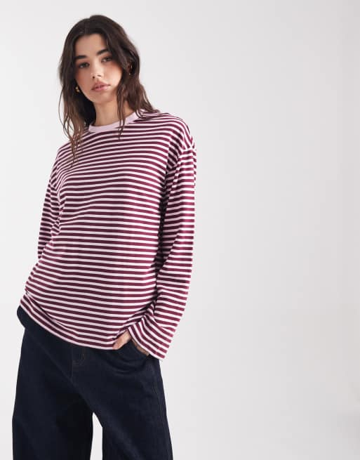 Pieces – Rosa och vinröd, randig t-shirt med långa ärmar