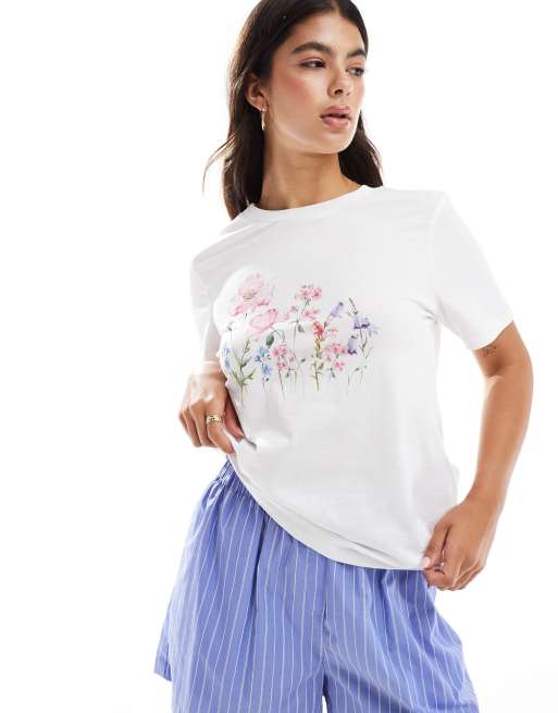 Pieces – Vit t-shirt med blomtryck framtill