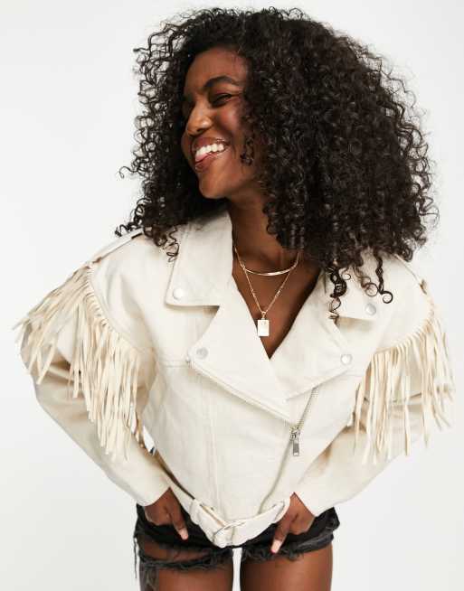Pimkie – Gräddvit jeansjacka med fransdetaljer