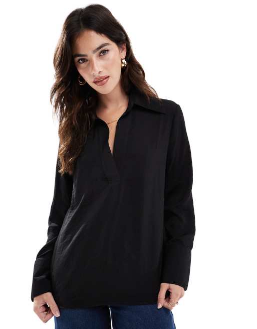 Pimkie – Svart, avslappnad skjorta med kragdetalj, lång ärm och v-ringning