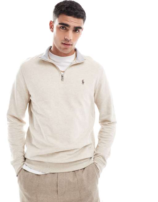 Polo Ralph Lauren – Beige melerad sweatshirt med dubbel stickning, dragkedja vid halsen och ikonisk logga