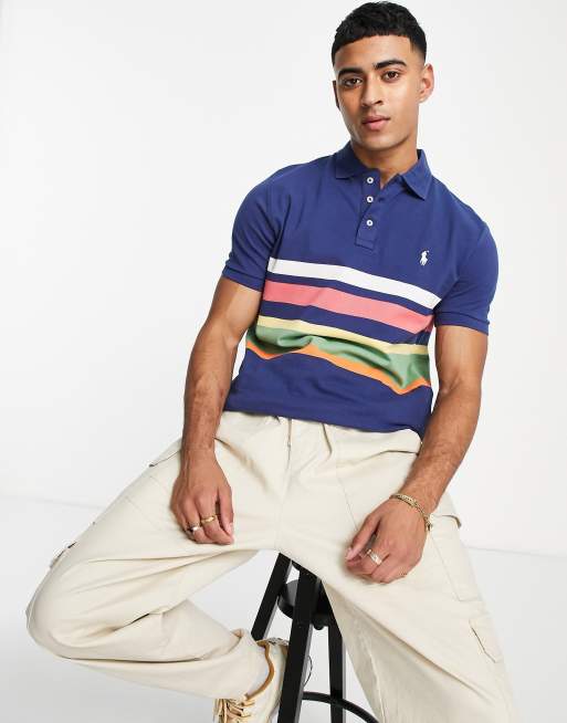 Polo Ralph Lauren – Marinblå flerfärgat randig pikétröja med ikonlogga framtill