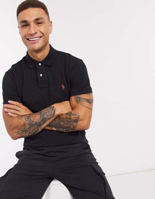 Polo Ralph Lauren – Svart, tvättad pikétröja med röd logga och smal passform