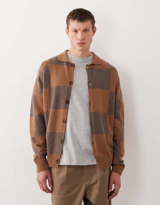 Pompeii – Brun och grå, rutig, stickad kofta med pikékrage och knappar