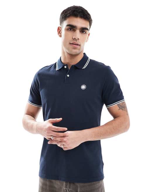 Pretty Green – Marinblå pikétröja med logga och kantränder