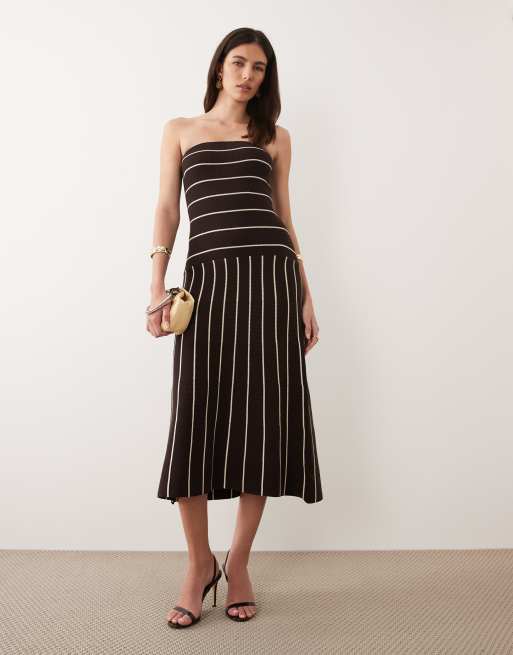 Pretty Lavish – Brun, vitrandig, stickad midiklänning med bandeau-ringning