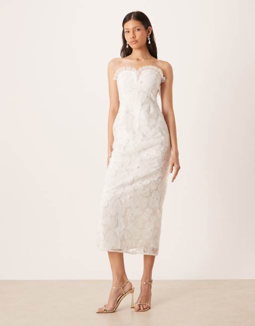 Pretty Lavish – För bruden – Elfenbensvit midaxiklänning med volangkrage, hjärtformad ringning och pärlor i blommig tyll