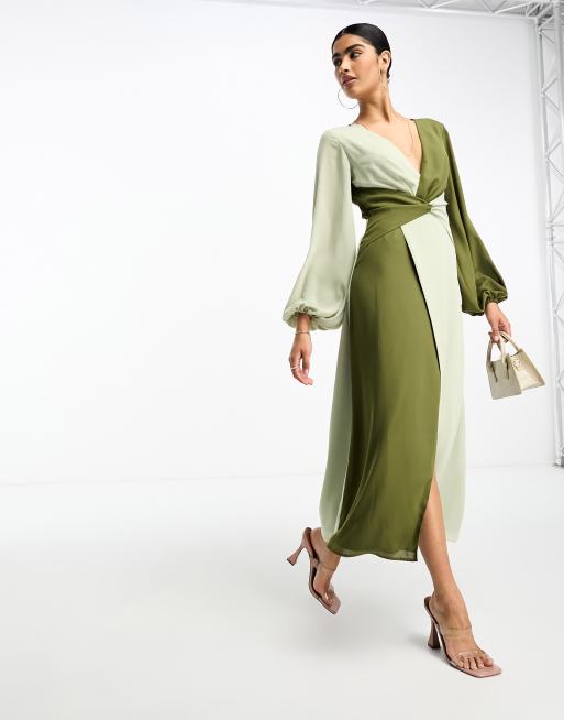 Pretty Lavish – Olivgrön och salviagrön midiklänning med kontrasterande design och knut framtill