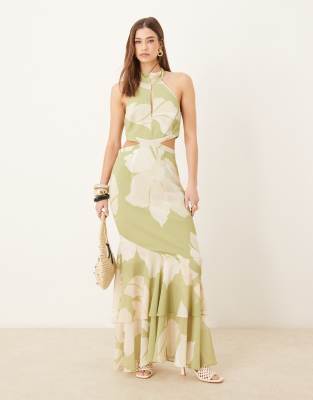 Pretty Lavish – Olivgrön, storblommig maxiklänning med utskurna detaljer och volang