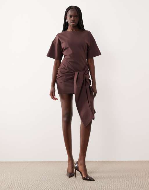 Pretty Lavish – Olivia – Brun miniklänning i jersey med sänkt axelsöm, draperad detalj och knytning