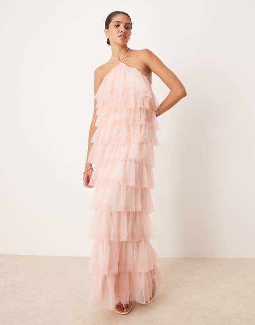 Pretty Lavish – Pionrosa maxiklänning i tyll med volanger och bar rygg