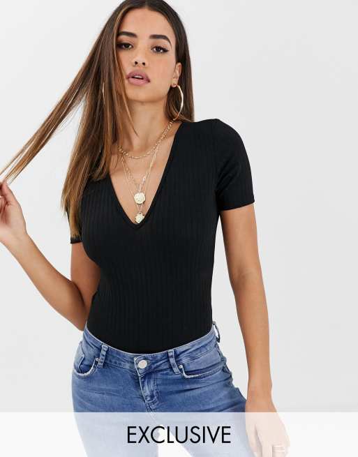 PrettyLittleThing – Exclusive – Basic – Svart ribbad body med v-ringning