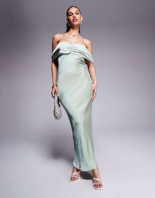 Princess Polly – Salviagrön maxiklänning med bardot-ringning och rynkning framtill i satin