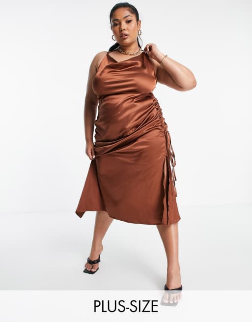 Public Desire Curve x Amber Gill – Brun midiklänning i satin med smala axelband och rynkning i sidan