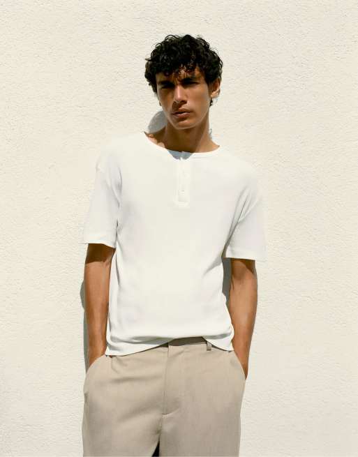 Pull&Bear – Basic – Vit t-shirt i henleystil