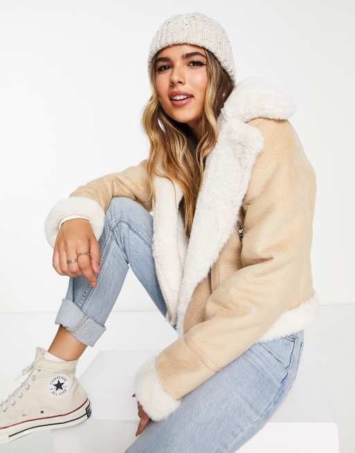 Pull&Bear – Beige pilotjacka med fuskpäls